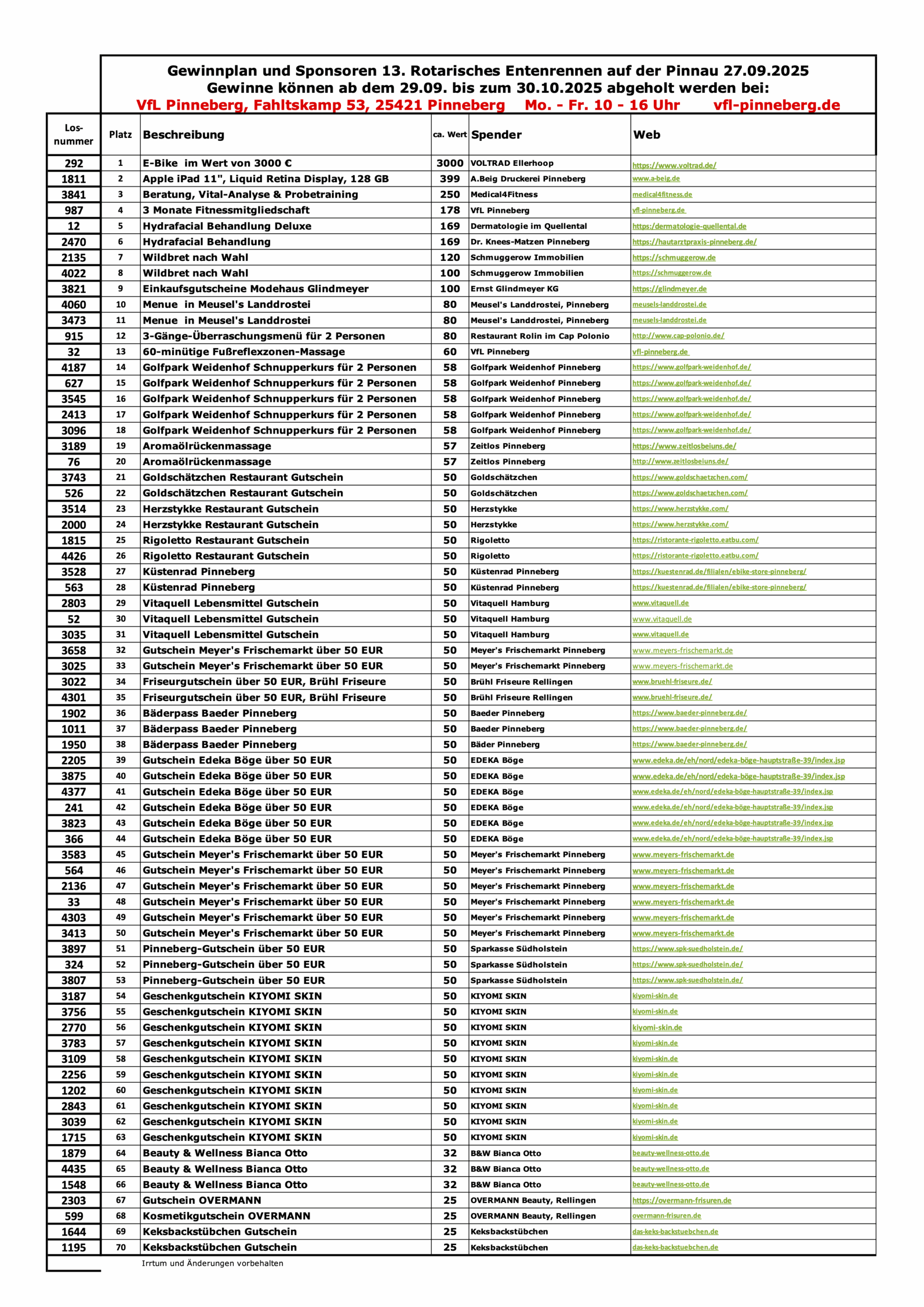 Die Gewinnausgabe erfolgt am Veranstaltungstag nach Abschluss des Rennens im Zielbereich gegen Vorlage des Losscheins. Nicht anwesende Teilnehmer haben die Möglichkeit, sich in den Wochen nach dem Rennen über ihren möglichen Gewinn im Internet zu informieren ( www.entenrennen-pinneberg.de). Die Gewinner müssen ihre Preise bis zum 30.10.2025 gegen Vorlage des Losscheins beim Veranstalter abholen. Die Abholadresse sowie die Abholzeiten werden auf der Homepage bekannt gegeben. Ein nicht bis zum 30.10.2025 abgeholter Gewinn verfällt. Nicht abgeholte Gewinne verfallen zu Gunsten des Lotteriezwecks.